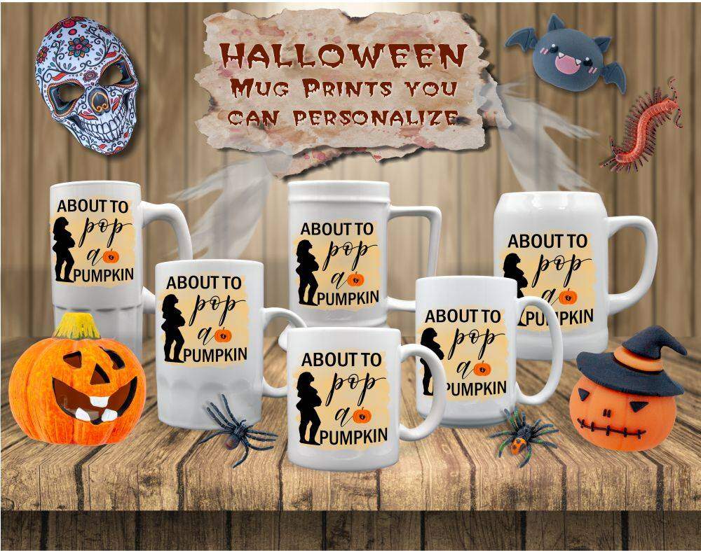 Get into the spooky spirit with our Halloween Mugs & Steins! Perfect for the expecting mother, these 11oz and 15oz coffee cups, root beer mugs, and beer steins are vibrantly printed with ‘About to Pop a Pumpkin’. Want to add a personal touch? Simply send us your photos and text, or even a hand-written message. Follow our easy steps for a custom touch. Make this Halloween special and unique!