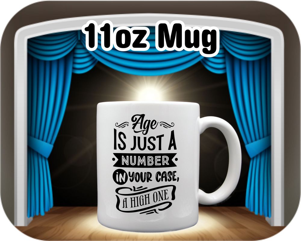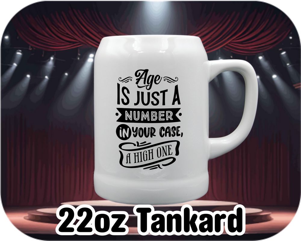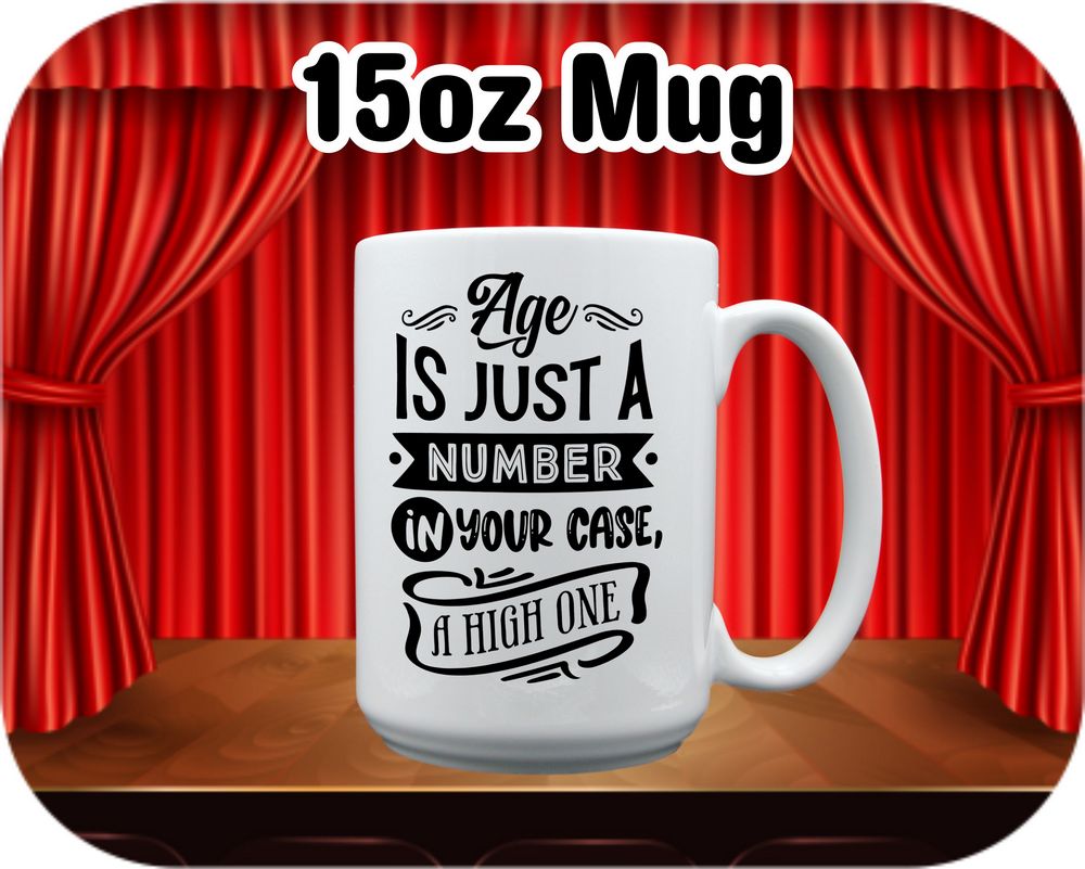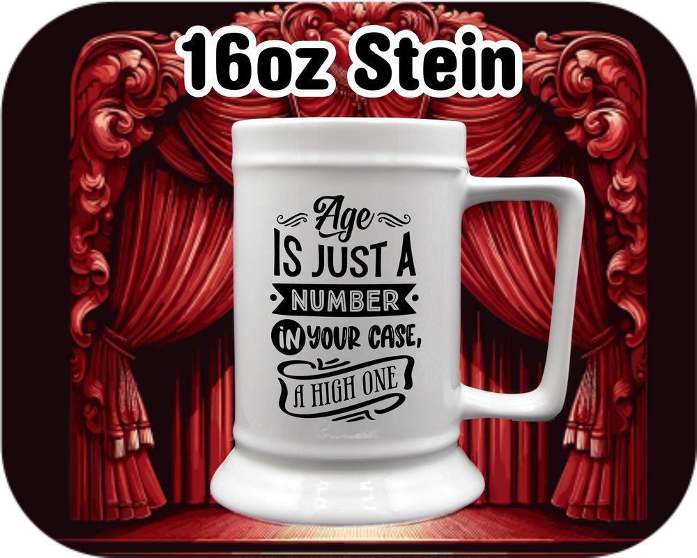 Embrace your age with a touch of humor! These customizable mugs and steins are perfect for sipping your favorite beverages. Available in 11oz and 15oz sizes, as well as a root beer mug or beer stein option. Crafted from high-quality ceramic, each piece is printed with the fun quote ‘Age Is Just A Number, in your case a high one’. Add a personalized touch to your drinkware collection today!