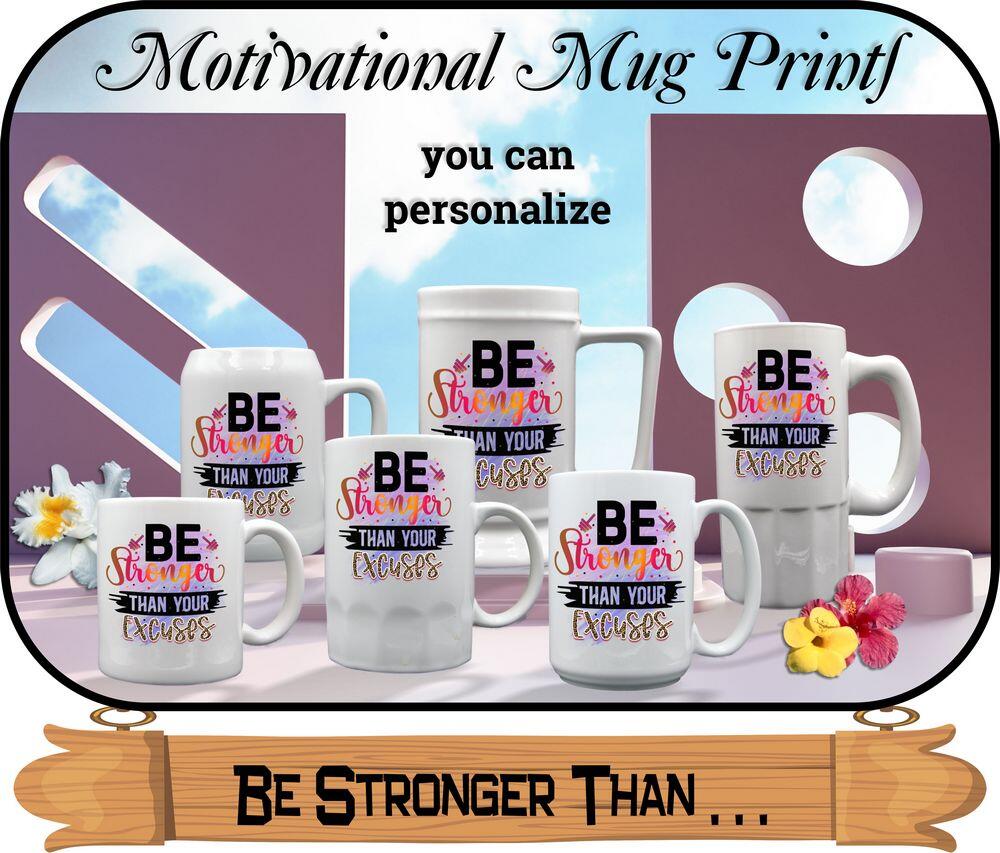 Wake up to inspiration every morning with our customizable Motivational Mugs and Steins! Crafted with high-quality ceramic, these mugs come in various sizes from a classic 11oz coffee cup to a hearty 22oz tankard. Dishwasher safe and durable, they are perfect for both hot beverages and cold drinks like root beer or beer. Each mug is adorned with the powerful message “Be Stronger Than Your Excuses” to kickstart your day on a positive note.