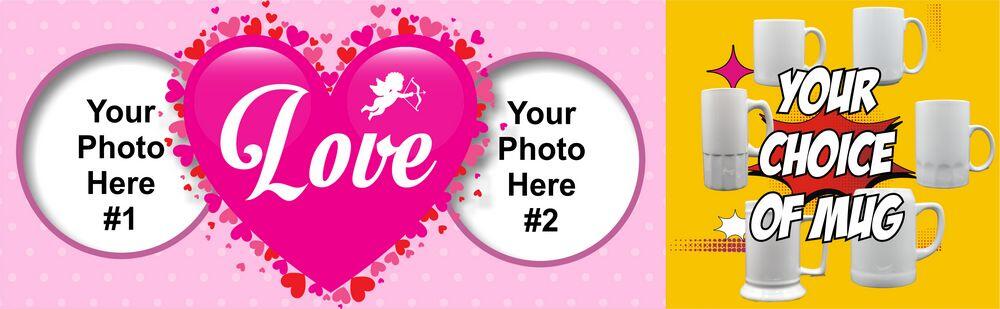 Romantic couple coffee mugsWe will insert your favorite photo in this romantic mug template. This print combined with your photo on your choice of mug makes for a nice custom Valentine mug or just to say “I Love you” Not sure what photo to use with our romantic mug design? That’s ok, send us up to 3 different photos and we will generate a mock-up preview for each photo, then you can choose.
