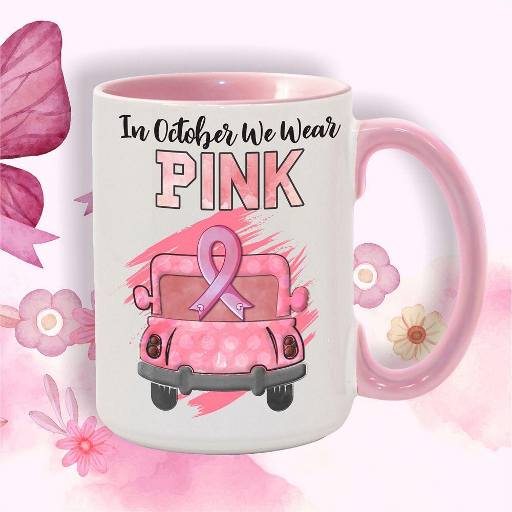 Support the fight against Breast Cancer in style with our “In October We Wear Pink” personalized coffee mug. Available in two sizes, 11oz and 15oz, this stunning pink mug is not only a perfect addition to your morning routine but also a powerful statement of solidarity for breast cancer awareness.