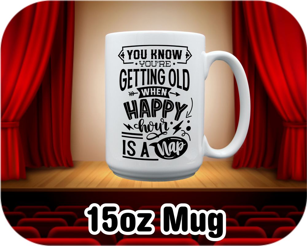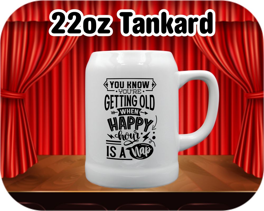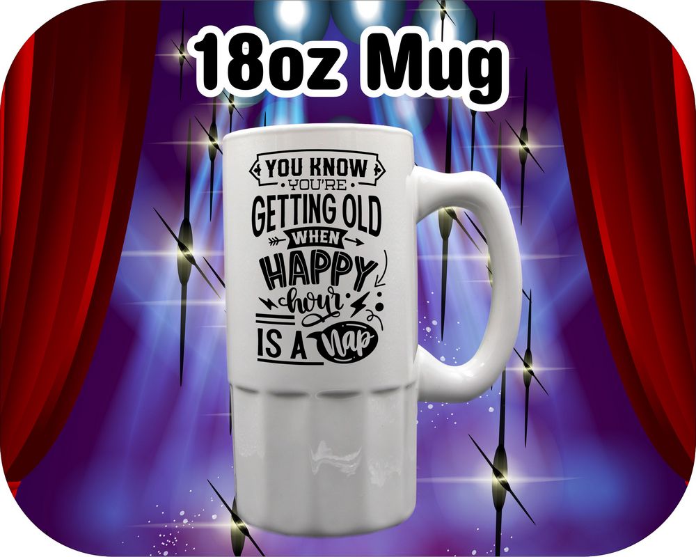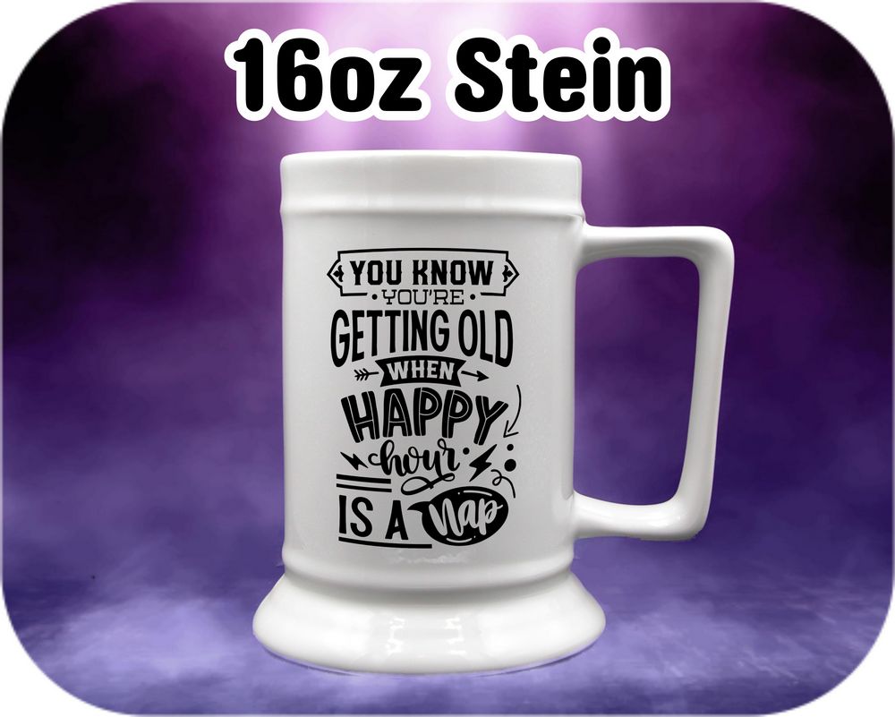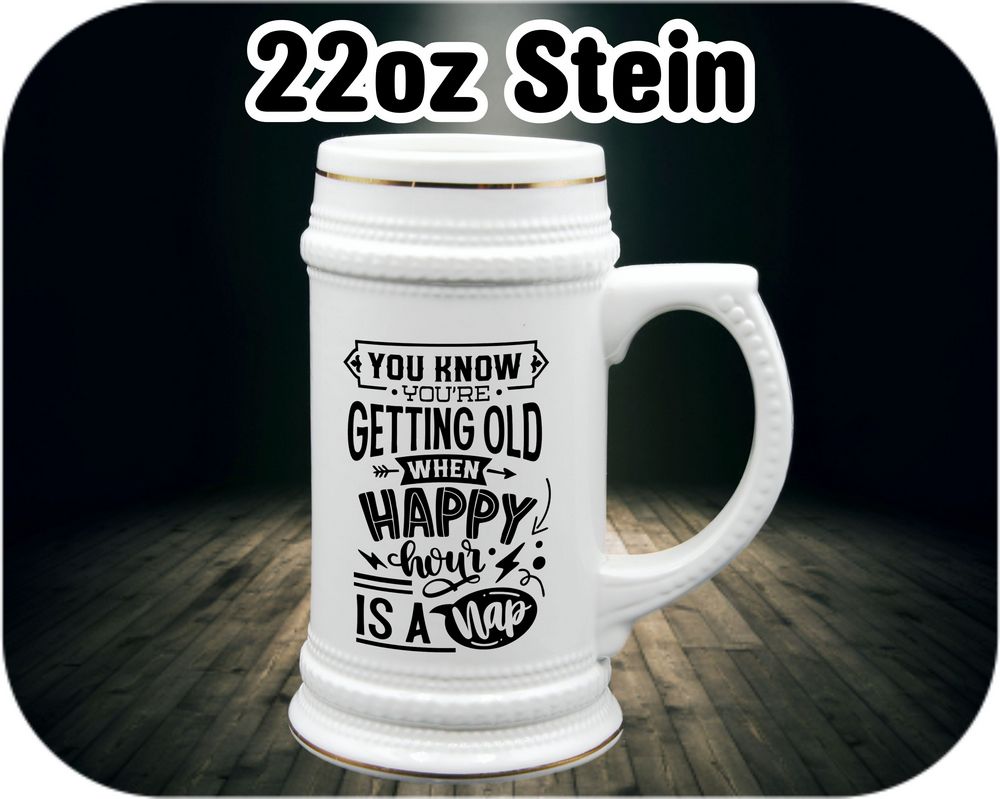 Personalize your mug or stein with photos, names, or messages to add a unique touch. With the fun quote “You Know You’re Getting Old When Happy Hour is a Nap” printed on each piece, these items make a great gift for friends or family members who appreciate a good laugh. Whether you’re sipping your morning java or enjoying a cold beer, our humorous mugs and steins are sure to bring a smile to your face and add a playful touch to your drinkware collection.