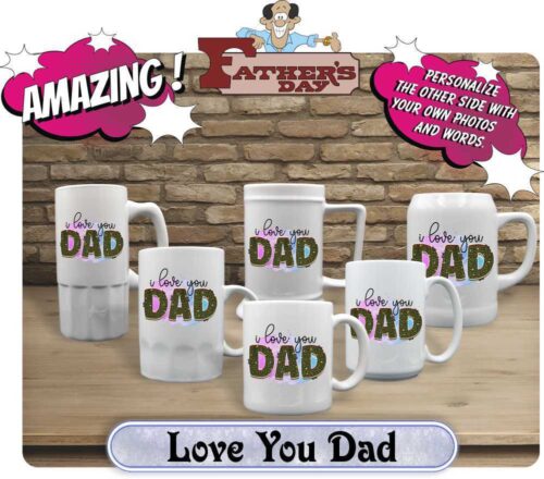 Surprise your dad with a heartfelt gesture using our Love for Dad Mugs & Steins! Personalize with photos, names, and messages, including a child's handwritten note. Choose from 11oz coffee cups, 15oz coffee mugs, 18oz beer steins, or 22oz tankards. Crafted from ceramic and printed bright with "Love for Dad." Easy to add a personal touch – just snap a photo of your child's message and submit it with your order. Make dad's day special!