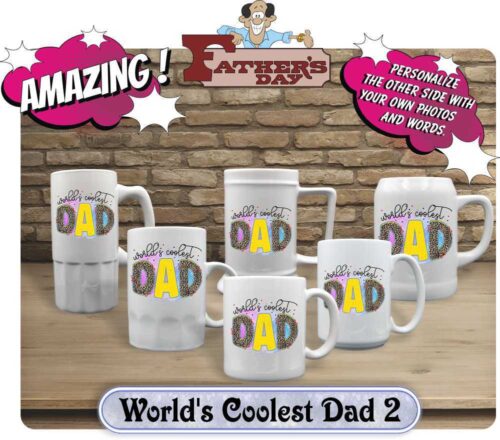 Cheers to the World's Coolest Dad with our personalized mugs & steins! 🍺🌟 Choose from 11oz coffee cups to 22oz tankards, all printed with 'World's Coolest Dad'. Make it extra special by adding a message in your child's handwriting - simply submit a picture of their cute note with your order. The perfect gift for the coolest dad ever! 🎁✨ #JustForCoolDads